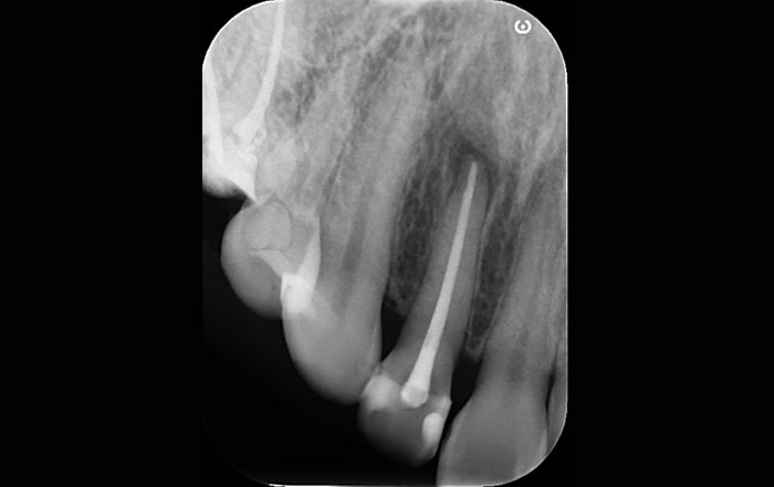 根管の中に根管充填材を入れているレントゲン写真です。