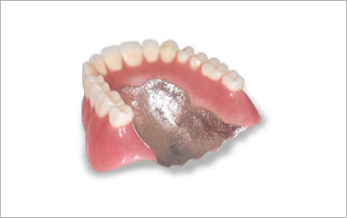 上記の「プラスチック義歯」と違い、プラスチックではなく金属を使用しているため義歯を厚みを薄くすることが可能なのと、金属なので熱を伝えるのにも優れています。
