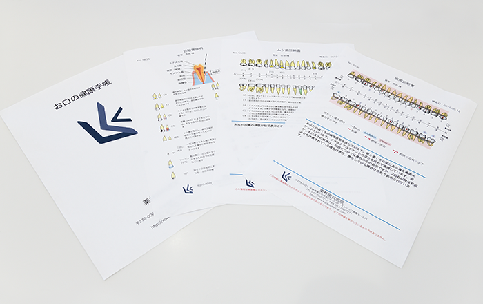 当院では分かりやすい情報提供と、患者様ご自身の理解を深めていただくため、Dental X(デンタルテン)というツールで、患者様の歯やお口の中全体の状態を「分かりやすいイラスト付きの診断書」としてまとめた、レポートのプリントアウトをお渡ししております。