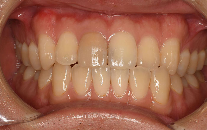 F2:第1度よりは濃く歯冠全体が一様に着色されていて、縞模様は見られない