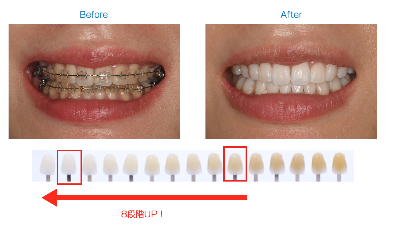 Beforeは矯正装置がついているため見づらいですが、結婚式にむけて装置を一度除去し、理想の白さにすることができました。