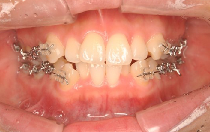 全てにワイヤーを掛けてしまうと前歯が外側に異常に出てしまうので、それを避けるため、まずは奥歯のみ、ワイヤーを掛けました。