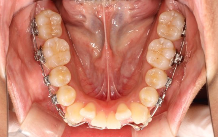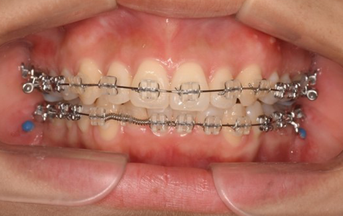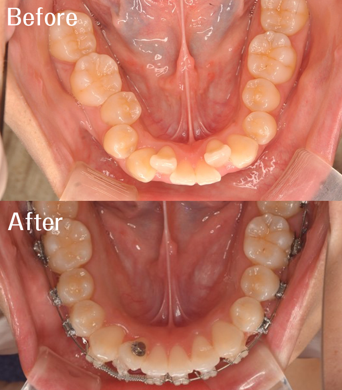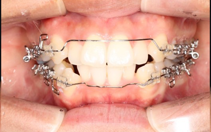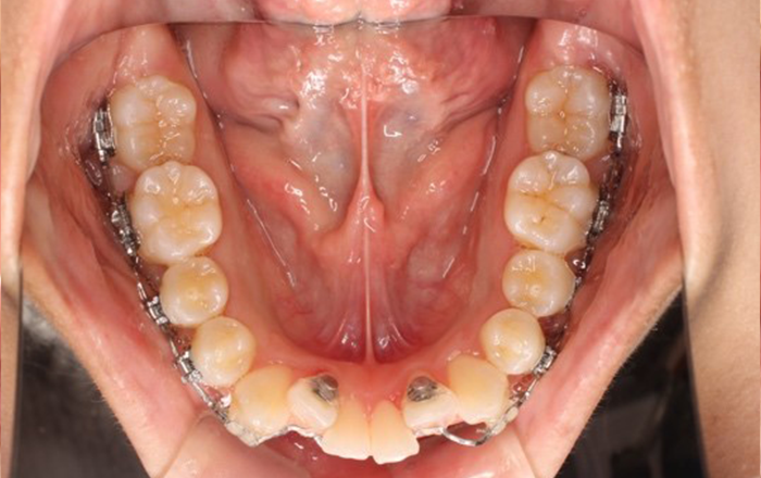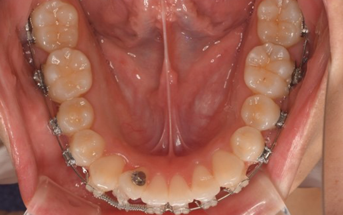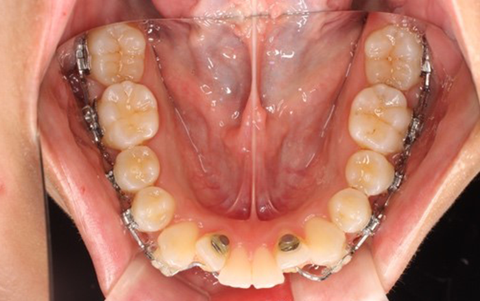 少し隙間が出来ているのがわかりますでしょうか。 下の前歯には、後ろに装置を付けゴムで引っ張っています。