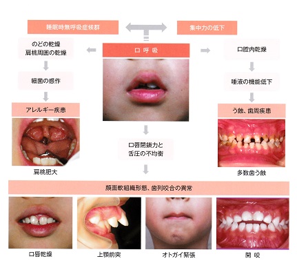 日常的に口呼吸をすることによって、お口の中の問題として、慢性的な口腔内の乾燥を引き起こし、それによる機能低下から、重度のむし歯・歯周病引き起こす可能性があります。