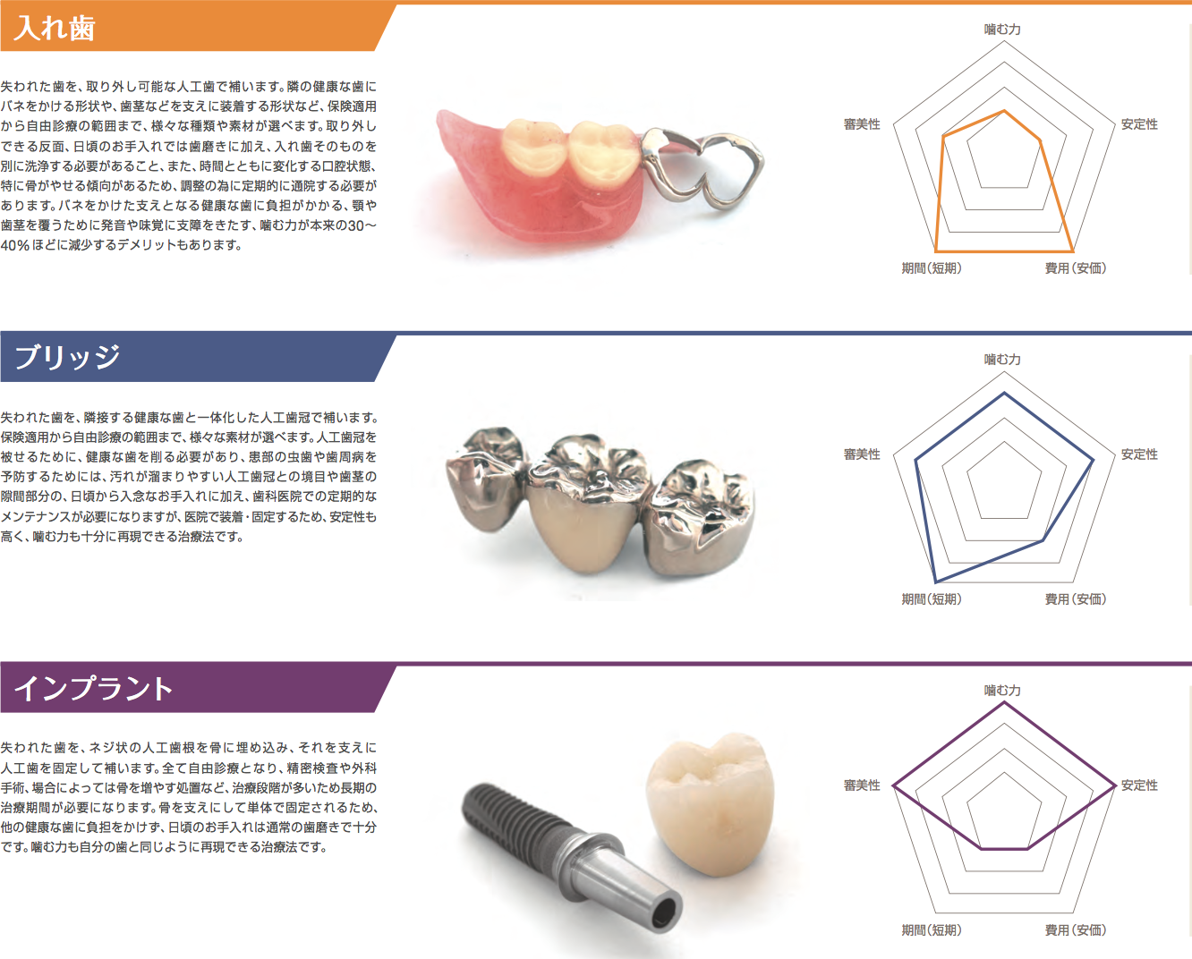 入れ歯と比較したメリットは、取り外しの必要がないこと、噛んだ時に動かないことです。