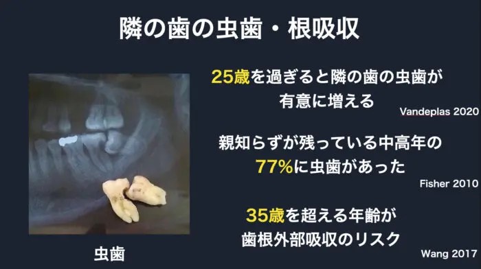 相談せず放置してしまうと、隣の歯はむし歯にもなってることが多く、親知らずも痛くて抜かないといけない、という状況が最も最悪です。