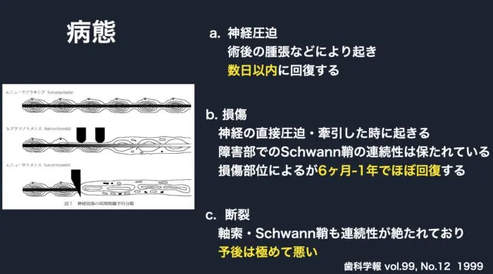神経が部分的に歯と癒着していると、抜歯する際に神経の一部が親知らずについていってしまい、損傷したり、抜歯操作時に神経管の薄い骨が折れて、それが神経の一部を損傷したり、といった抜歯時の操作によって起きます。
