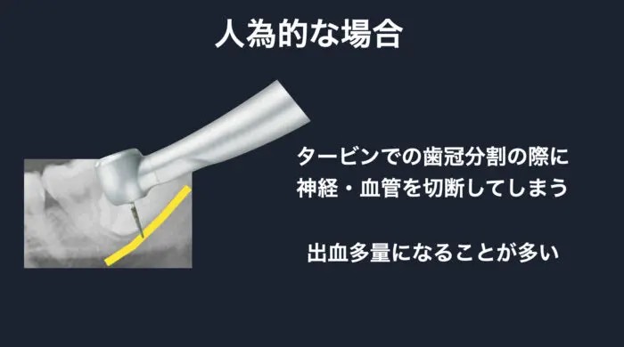 人為的な場合、下歯槽神経をバーで切削してしまうことで起きます。
