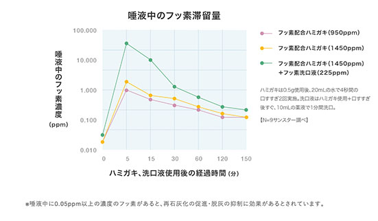 時間の経過とともにフッ化物(フッ素)濃度は減少はしていきますが、フッ化物(フッ素)入りの歯みがき粉と併用することで、お口の中にとどまってくれるフッ化物(フッ素)の量が多くなるというメリットもあります。