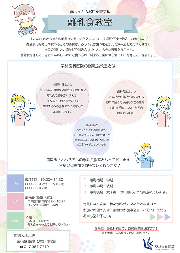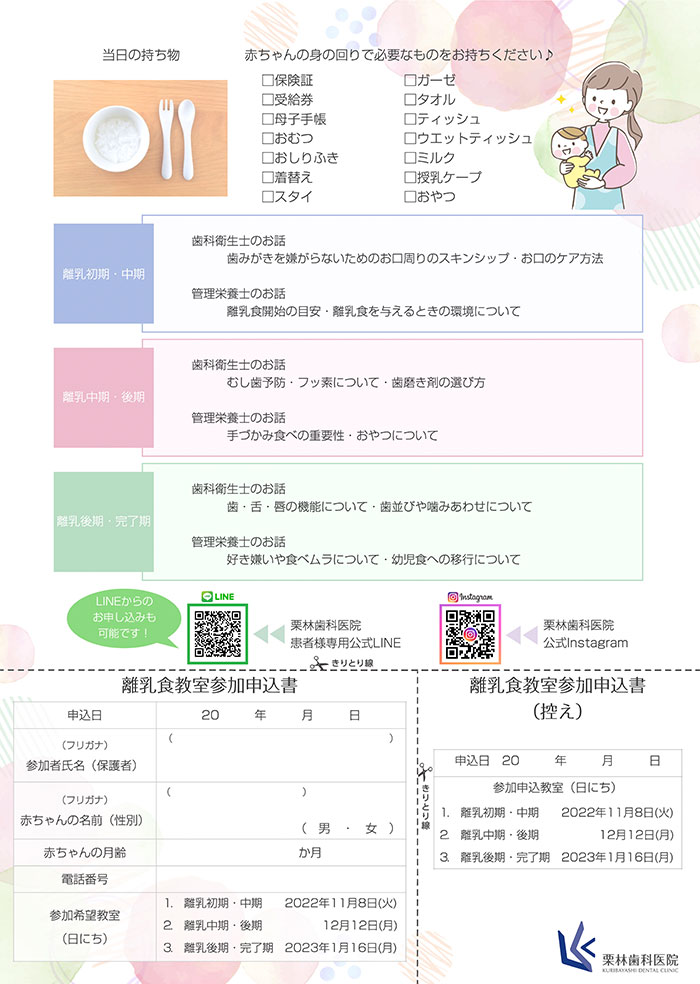 内容は、離乳食中期・後期・完了期の全3回に分かれ、今回の開催は、11月・12月・1月の3回です。