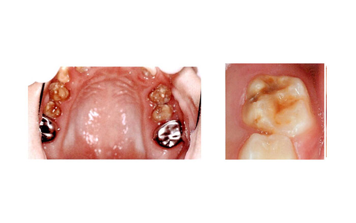 歯の表層のエナメル質に、白い点々ができたり、茶褐色の着色があったり、歯が生えてこないなど、症状はさまざまで、部位も一部分や、お口の中全体に現れるものなどがあります。