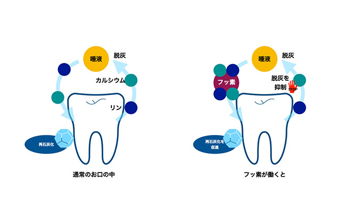 この状態の歯にフッ化物(フッ素)を使うことで、再石灰化が行われ、歯から溶け出したカルシウムやリンを歯の表面に戻し、歯を修復する働きがあります。