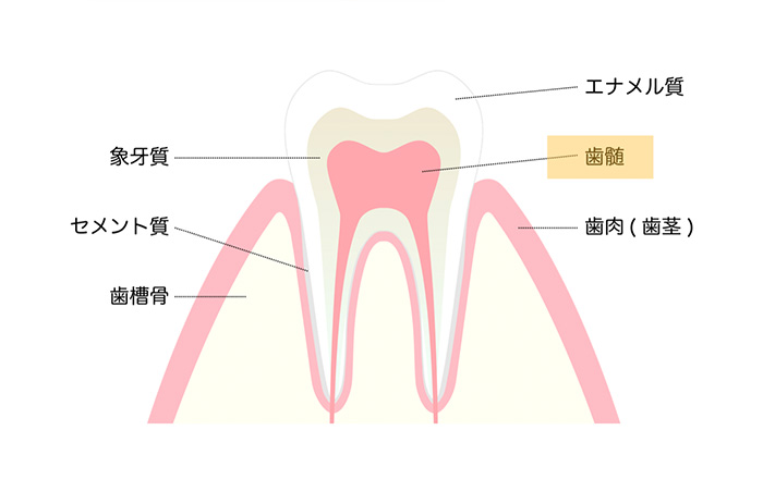 歯の内部には「歯髄腔」と呼ばれる神経が通っている部分があり、そこには神経と血管があります。