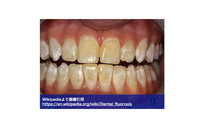 フッ素症は、小さい頃の永久歯が形成される時フッ素を多量に摂取すると、歯の表面に白い斑点のような模様(斑状歯)が出ることがあります。