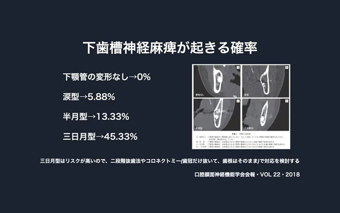 神経が部分的に歯と癒着していると、抜歯の際に神経の一部が親知らずにくっついていってしまい、神経が損傷したり、抜歯時に神経管の薄い骨が折れて、それが神経の一部を損傷したり、という抜歯時の動作によって損傷が起きます。