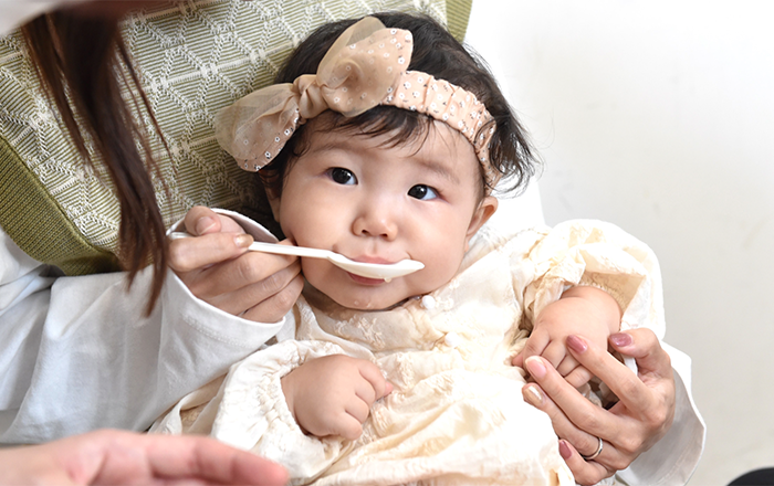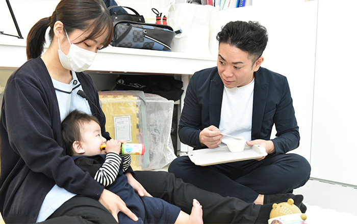 また、保護者の方向けに、おかゆを使った離乳食の疑似体験をしていただきました。