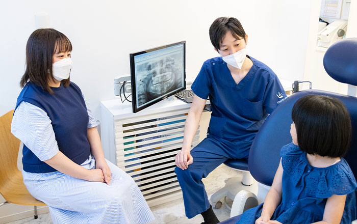 乳歯の抜歯の必要があるかどうかを、歯科医院のX線検査(CT・パノラマ)で調べ、しっかりと下に永久歯ができていることを確認します。