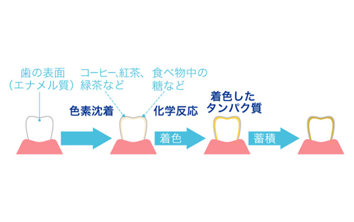 一般的に、食べ物などで歯が着色するのは、歯の表面に色素がつくのが理由です。