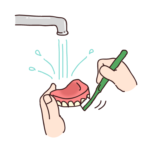 1番大事なのは、ご自身の歯と一緒で、入れ歯用の歯ブラシかもしくは手用の歯ブラシで綺麗に汚れをとることです。