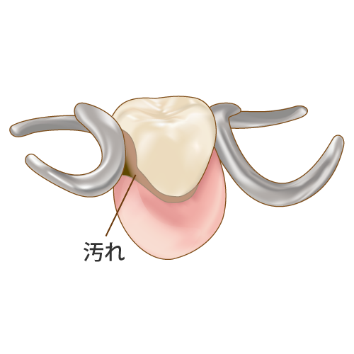 また、入れ歯を入れることで汚れが残りがちなところは、ご自身の歯の入れ歯のバネがかかっているところです。入れ歯を支えるための大事な歯なので、今まで以上に歯間ブラシやタフトブラシを用いて清潔に保ちましょう。
