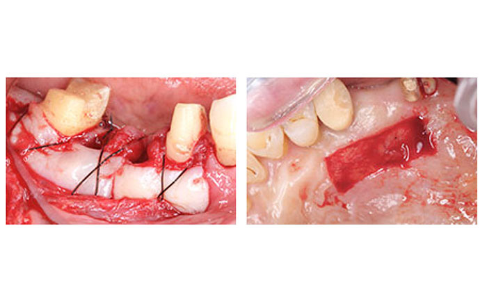 歯ぐきを開いて炎症のある組織を除去し、その中に、骨の再生を誘導する「タンパク質」の製剤を入れ、足りない量の「骨」を移植し、骨を再生したい部分に歯ぐきが入り込まないようにコラーゲンの「膜」を敷きます。