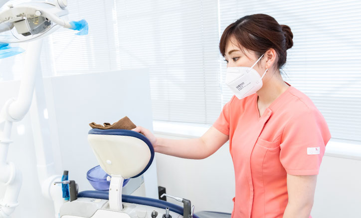 マスクの着用 スタッフ全員が必ずマスクを着用しています。また、患者様にも必ずマスクを着用していただくようお願いしています。