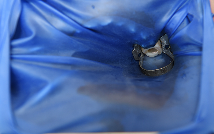 歯質が十分に残っていれば、ラバーダムを取り付け、根管治療を行う。