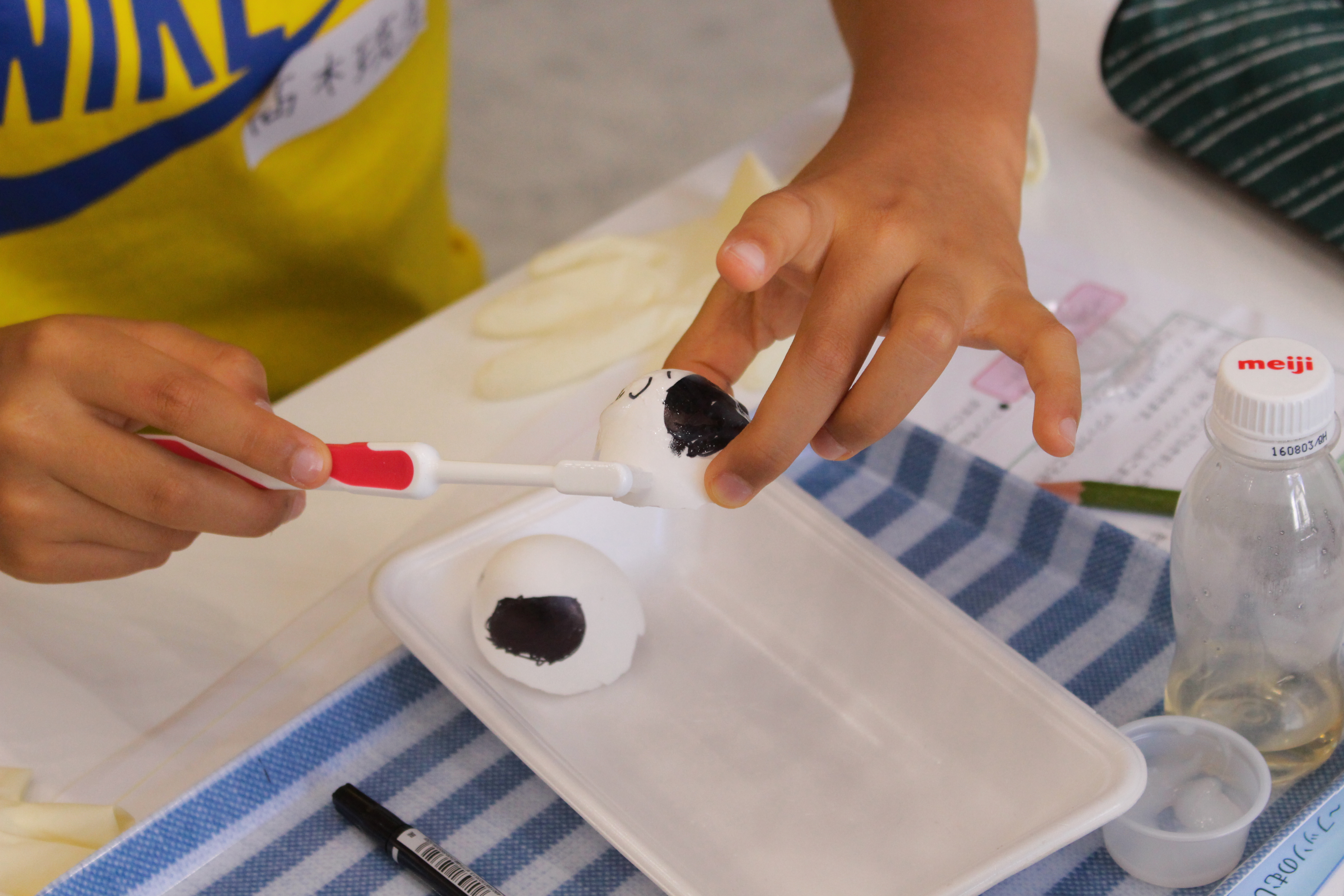 このように卵の殻を使って、虫歯予防の “フッ素” 効果を 眼で確認する実験を行いました。