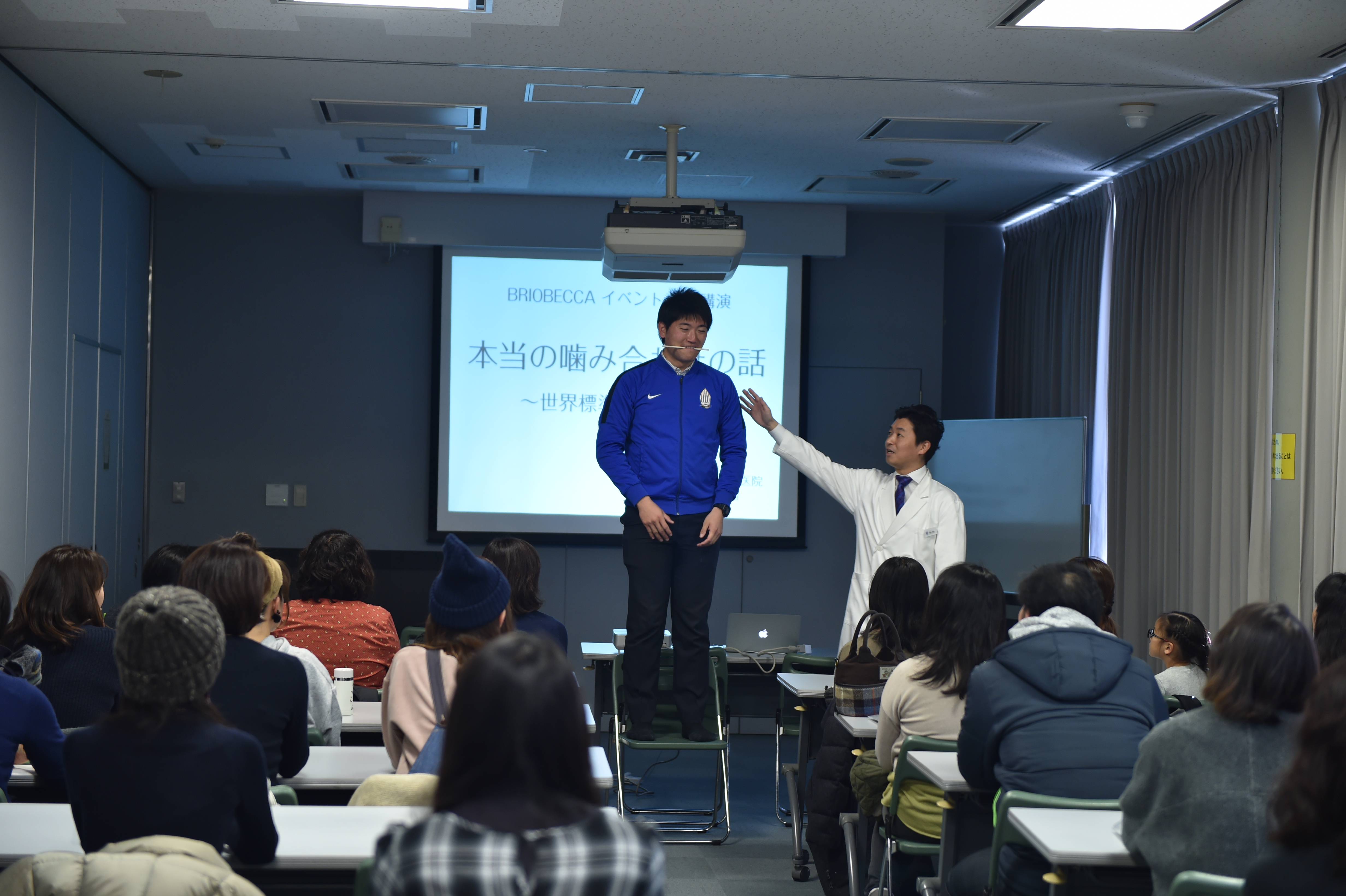お子様と保護者様にご参加いただき、 お子様はブリオベッカ浦安のイケメン選手達とのサッカーを楽しむ! その間、保護者様には当院理事長の栗林から、 噛み合わせ や 海外と日本の歯科に関しての違いなど、 をお話させていただく! といった内容です。 まずは開会式 栗林歯科医院や理事長の自己紹介、そしてサッカーを教えてくださる6名の選手紹介 お子様達はプロのサッカー選手達を目の前にしてとても嬉しそうでした!