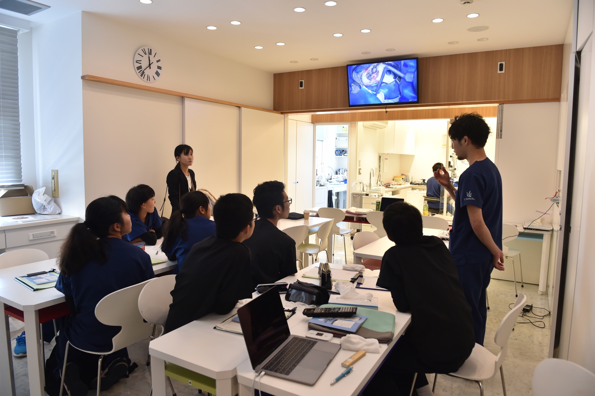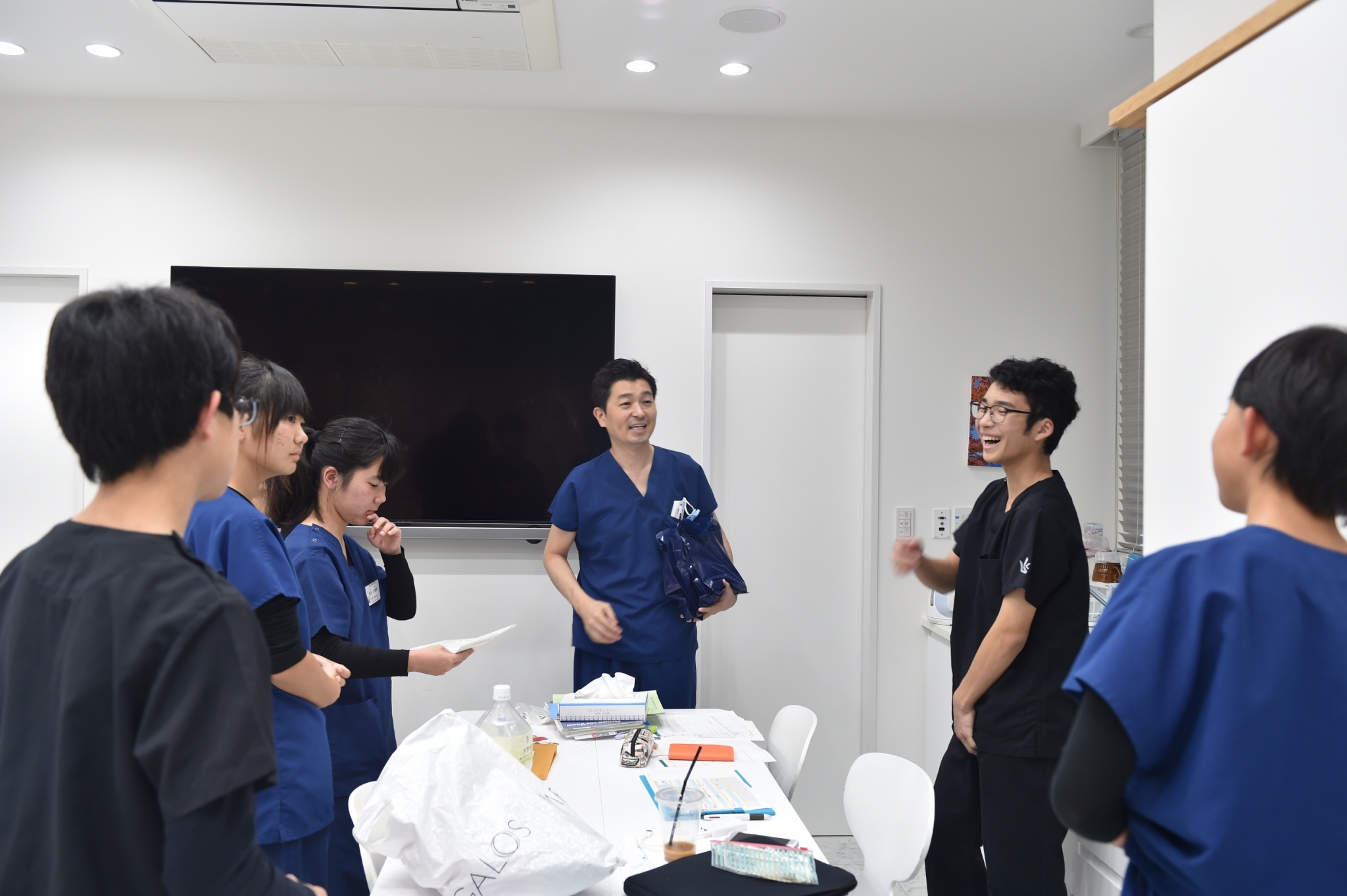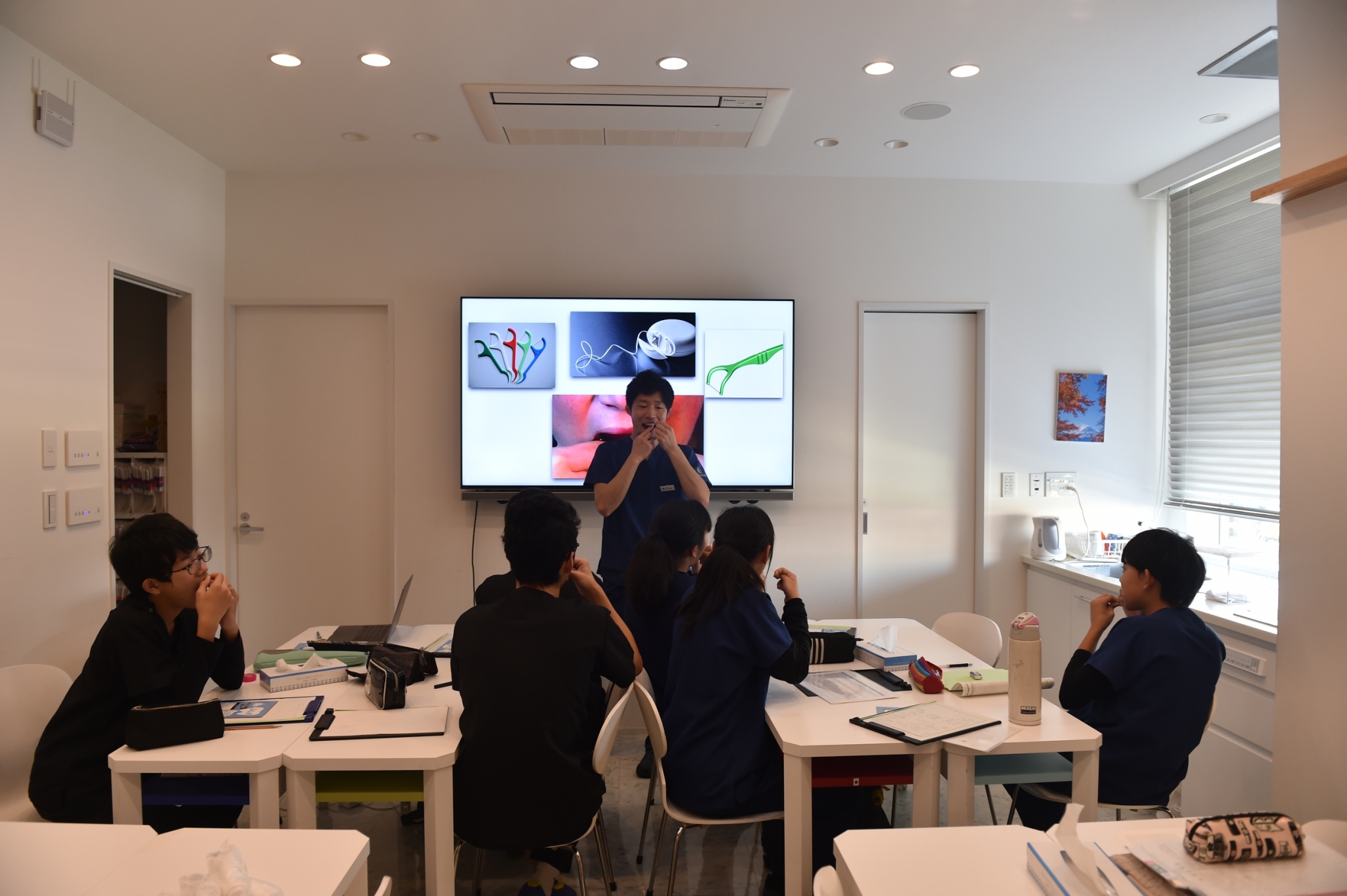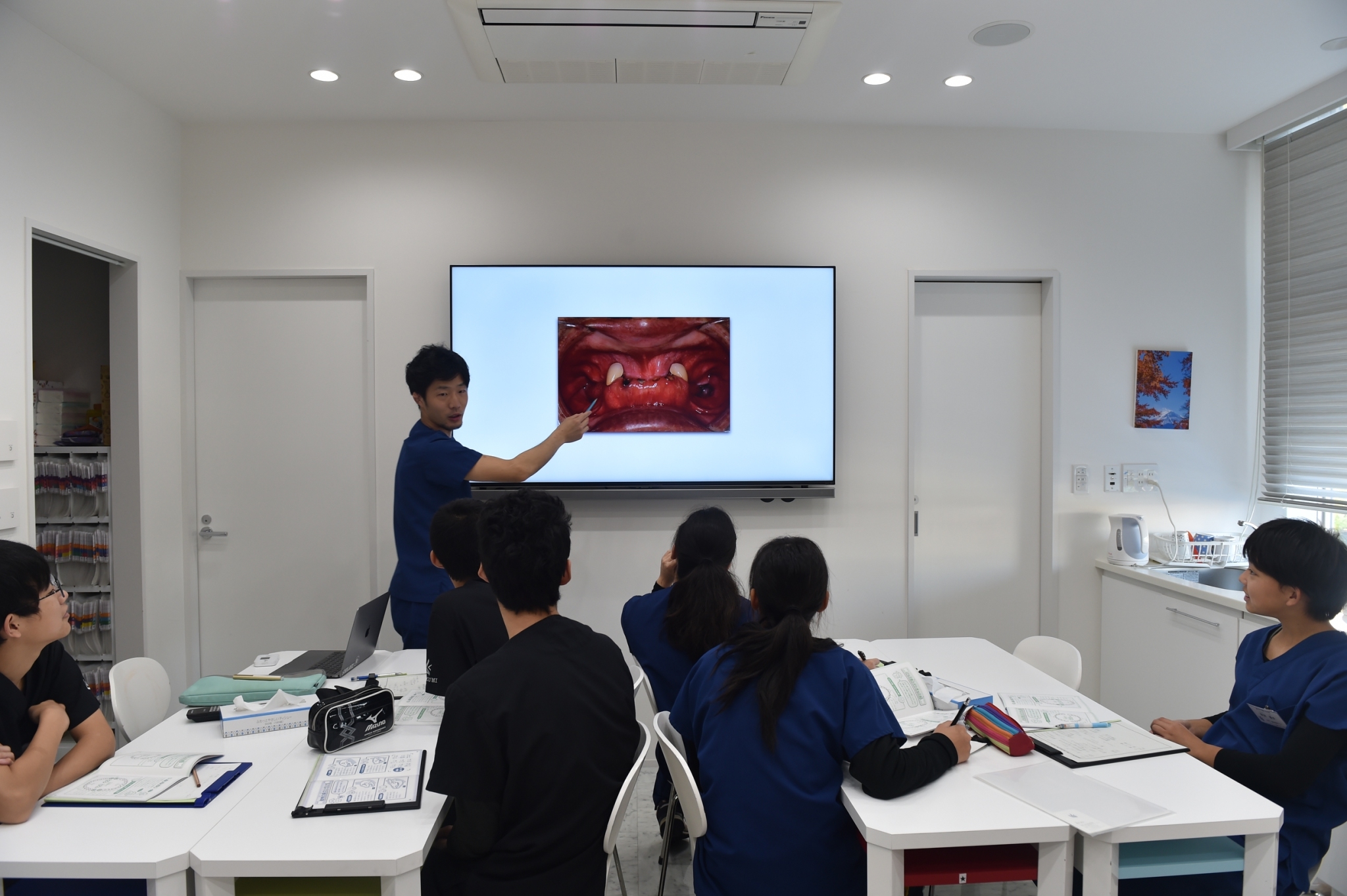 職場体験 朝礼2                     午前中は、“当院の物知り先生”の田中義篤先生からのレクチャーを行いました。   職場体験 田中                 ・歯の仕組みは? ・なぜ虫歯になるのか? ・矯正治療って? など、歯についてをわかりやすく説明してくれました。   フロスの使用方法なども実践です! 職場体験 フロス                 田中先生、この日のために動画やプレゼン資料を用意してくれました。 生徒さんだけでなく、スタッフも楽しめる内容でした(笑)     次に、津島先生から歯科医師がどんな機材を使って治療しているかのレクチャーです。 マイクロスコープの説明をしています。   職場体験マイクロチェック                   そして実際にマイクロスコープを使用しての診療をライブオペで見学です。   職場体験マイクロでも                 しかも田中先生からの解説付き! 初めて見る光景に、生徒さん達もビックリしたようです。     やはり【職場体験】ということなので、 午後からはスタッフ達が行なっている業務のお手伝いをしてもらいました。     カルテ用意・整理 職場体験カノン                   職場体験ユリア     器具をしまう滅菌パックの作成 職場体験タクト                 その他にも事務のお仕事など含め、 皆さん一生懸命やってくれました。     2日間の体験を終えて、生徒さんもリラックス & 理事長とも仲良しになりました(笑)   職場体験 終わり                     今回の職場体験を通して、6名の生徒さん達には、 ◾️歯について ◾️歯科医院での仕事内容 をわかってもらい、   ◾️仕事の大切さ&大変さ ◾️何が自分に向いているのか??? ◾️もっといろんな職業を見てみたい! と、少しでも思っていただけたら嬉しいです。     2日間、スタッフにとっても貴重で楽しい時間でした!   職場体験3      ]]>