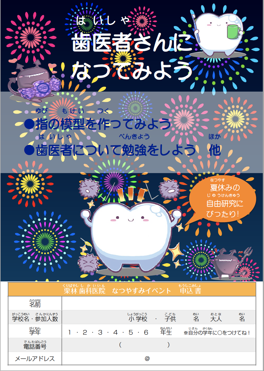 所要時間は1時間となっていますが、 少人数制でじっくりみっちりと歯医者さんの体験ができます!! 興味がある方は下記にご連絡ください。