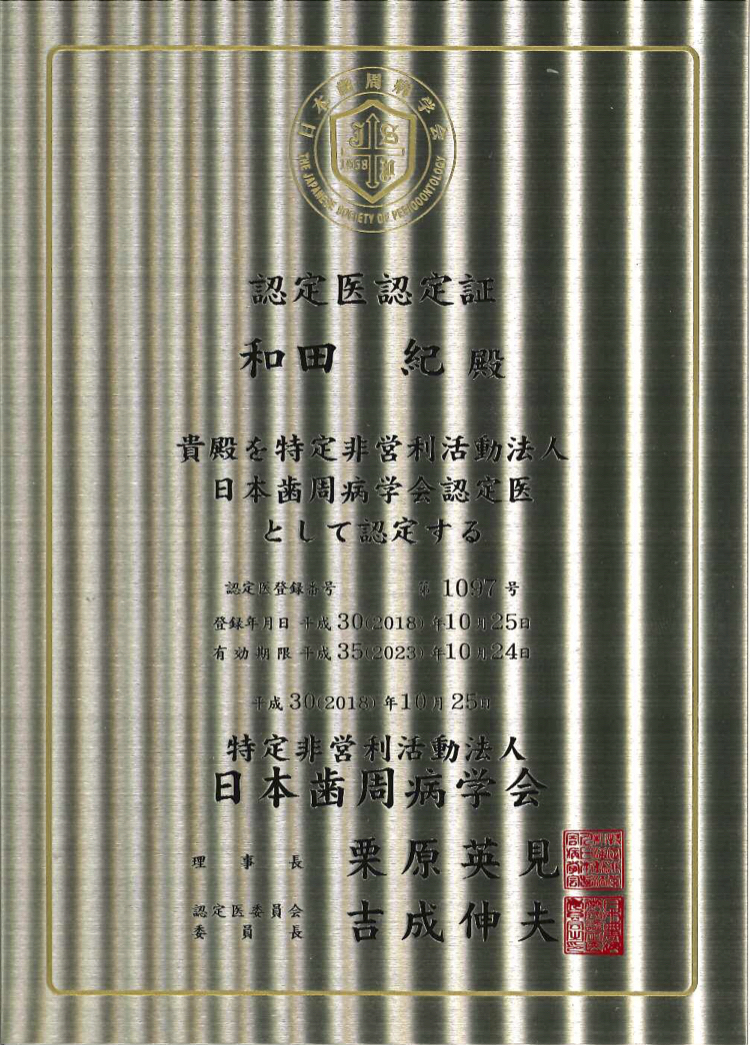 日本歯周病学会 認定医 の資格を取得いたしました!! syasinn                                                                 歯周病とは? 歯垢など、歯についたゴミの中にいる菌が原因で発症する病気です。 歯ぐきが腫れたり、出血してしまったり、 歯を支える骨が溶けてしまったり 歯が抜ける、といった症状が起こります。   詳しく知りたい方は堀口先生が書いたこちらをご覧くださいね! 歯周病について 歯周病について〜治療編〜     歯周病認定医とは? 5年以上の期間、学会に在籍し 3年以上の期間、学会で認められた機関での研修・臨床経験を積み 症例を提出後、筆記試験を経て資格取得した歯科医師のことを言います。 歯科医師とはまた別の資格で、+αの経験を積まないと取得できない、 歯周病の専門資格です。   歯周病に限らず、歯についてのお悩みがある方は、 まずは相談だけでも大丈夫なので、 お気軽にお電話お待ちしております!]]>