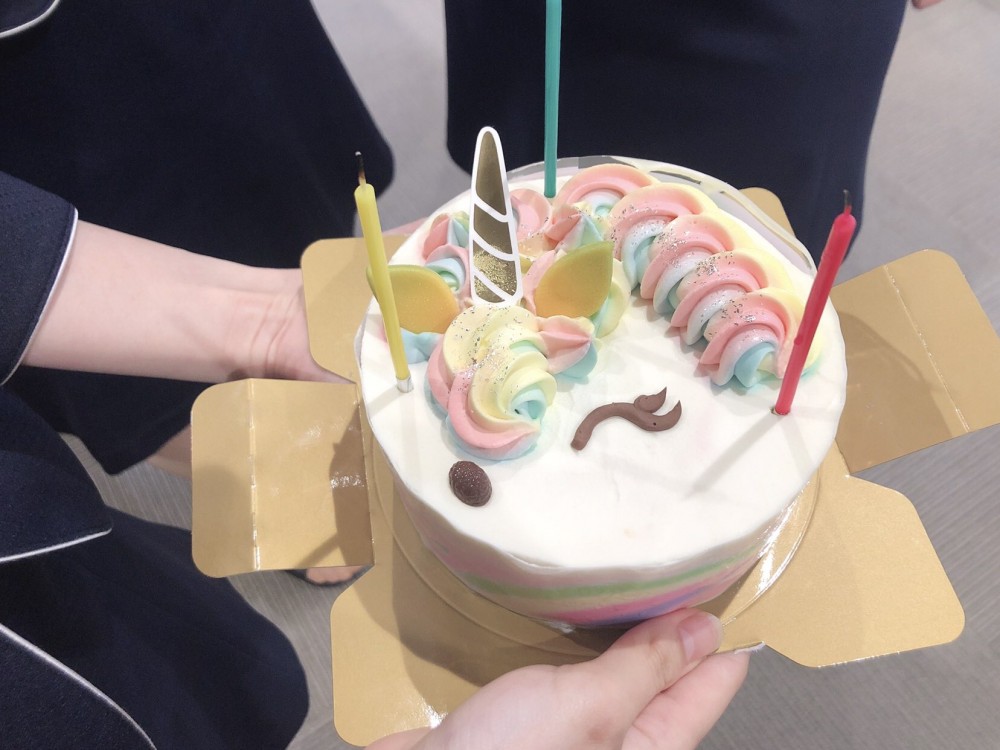 image-11   image-11.jp   ユニコーンが描かれていて中はレインボー!!! とっても可愛いですよね☆ みんなで少しずつ分け合って頂きましたが味も最高でした!!   越智さん、おめでとうございます!!!   image-12