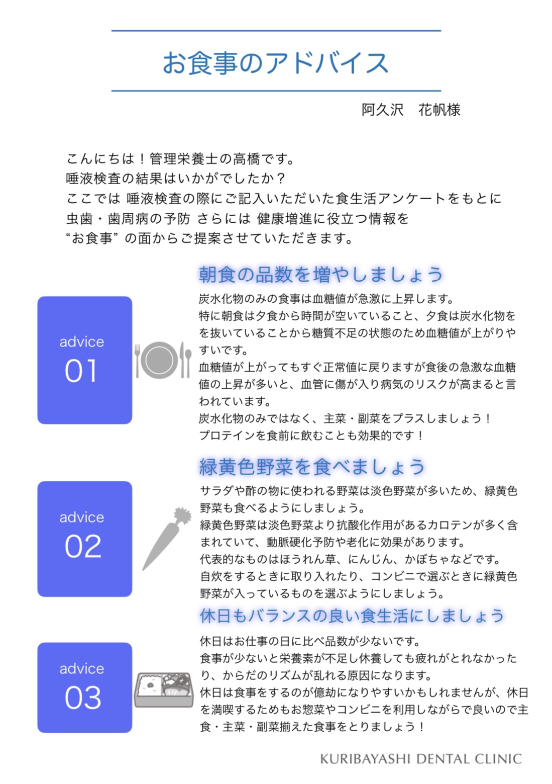 お食事の栄養面、バランスについてのアドバイスもさせていただいています。