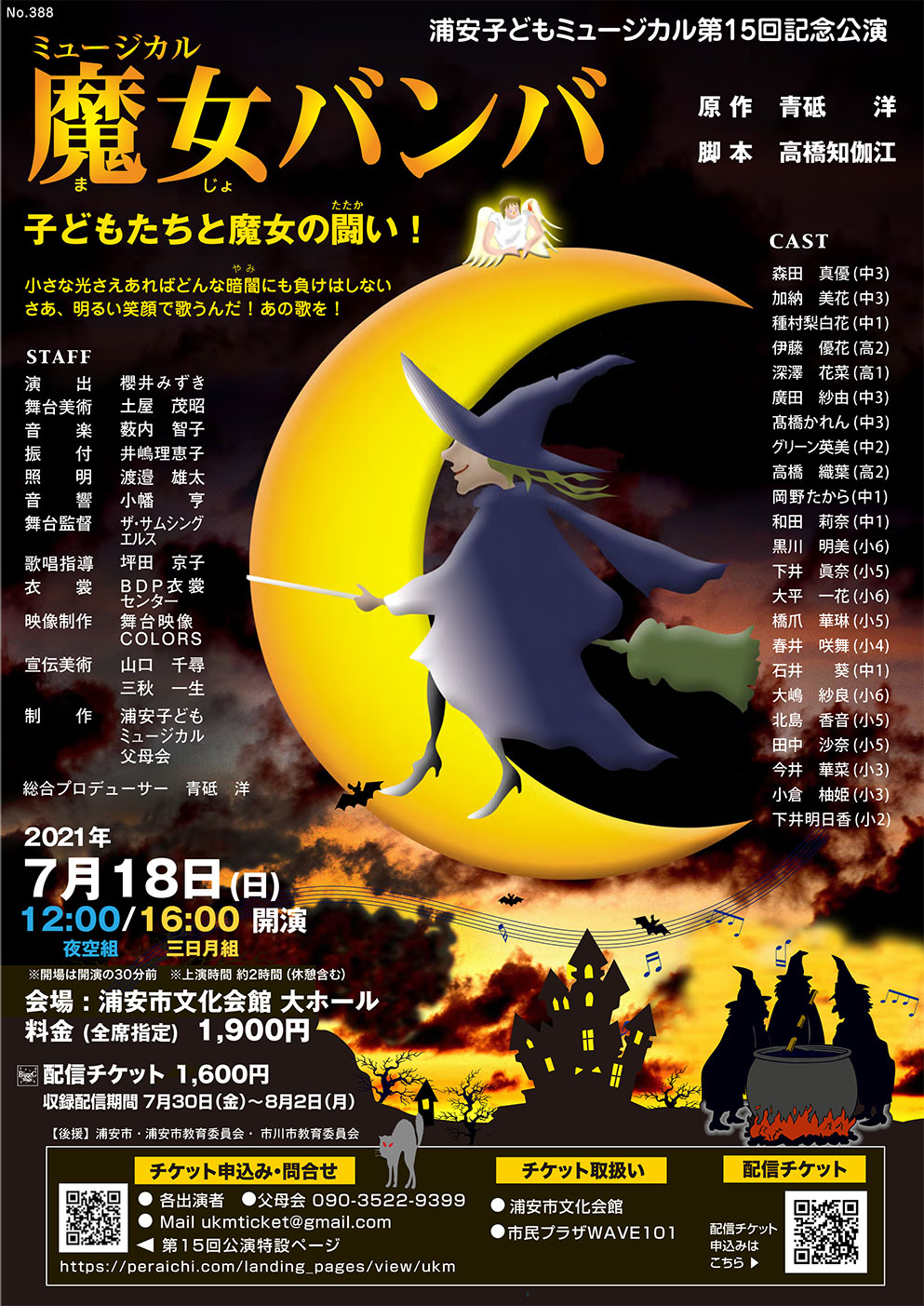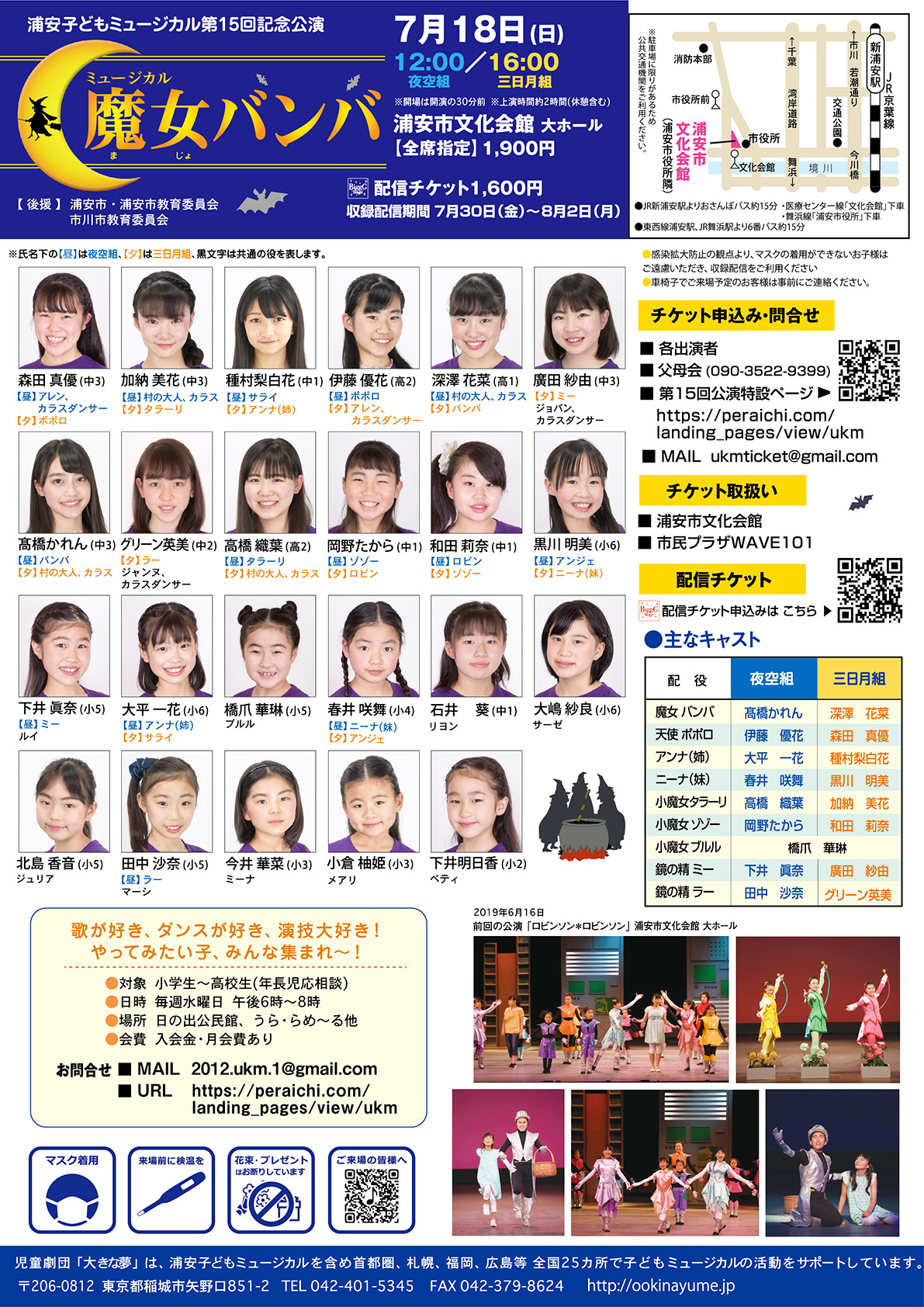 2020年は新型コロナウイルスの影響で、公演が中止となってしまったため、1年ぶりの公演です。 今年の公演についての詳細については以下の通りです。公演タイトル:魔女バンバ 日付:7月18日(日) 時間:12:00 / 16:00 公演 会場:浦安市文化会館 大ホール 料金:全席指定 ¥1,900 備考:公演特設ページはこちら