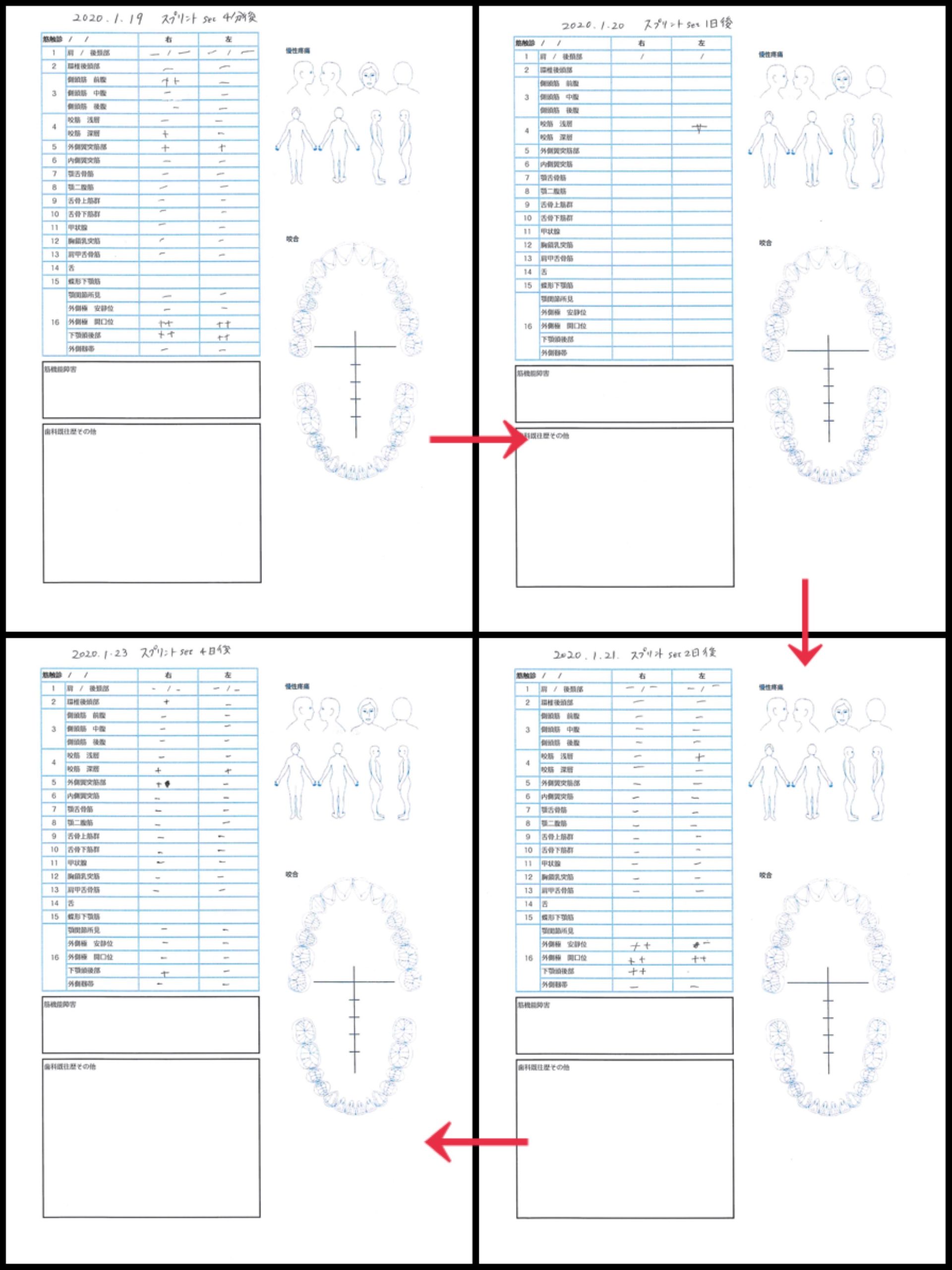 スプリントを装着し、4分後→1日後→2日後→4日後…と日を追って筋触診を行い、痛みのチェックを行います。