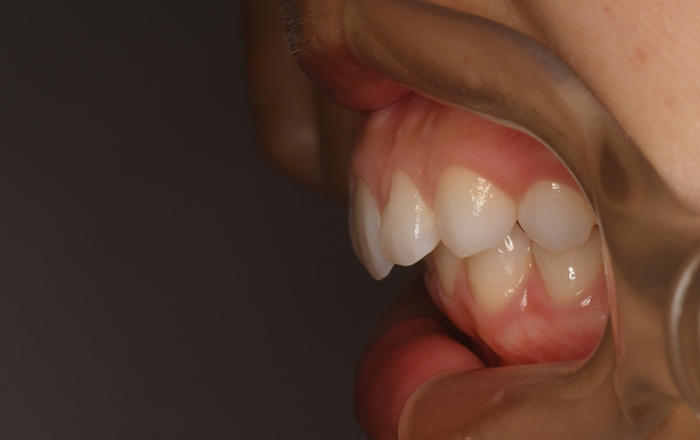 II級咬合の方は、奥歯で噛んだ時に、上の歯が下の歯を覆い、下の歯が見えなくなってしまいます。