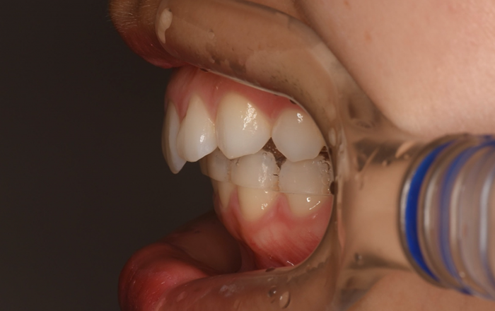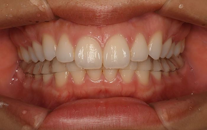 スプリントを装着することで、見えていなかった下の歯が見えるようになります。