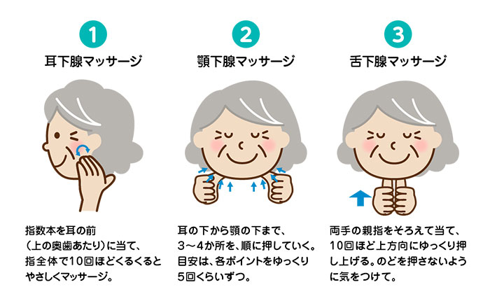 この3ヶ所をマッサージすることで、唾液の分泌が促されます。