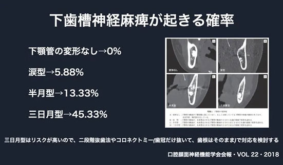 三日月型のように神経管の変形が強い場合は、歯の上の部分だけ取る方法や、二段階法、という方法を検討します。
