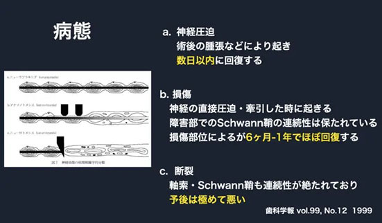 神経が部分的に歯と癒着していると、抜歯する際に神経の一部が親知らずについていってしまい、損傷したり、抜歯時に神経管の薄い骨が折れて、それが神経の一部を損傷したり、といった抜歯時の動作によって起きます。