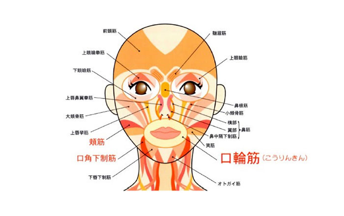 表情筋の多くは、直接的、間接的に口輪筋と結びついているので、口輪筋を動かすことで表情筋全体を動かす事ができます。