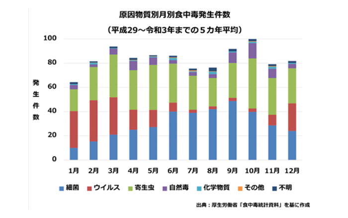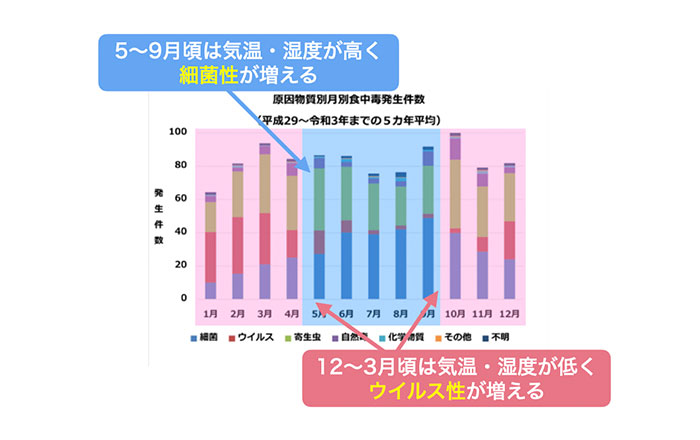 食中毒は年間を通して発生しますが、時期によって原因が変わります。