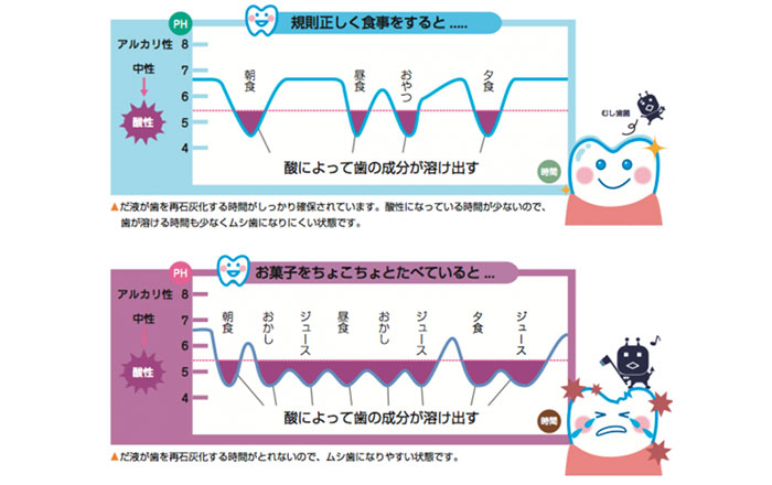本来、歯が溶ける時間より、歯を修復する時間が長いので、むし歯を防げていますが、間食や、ダラダラ食べが多くなると、お口の中は長時間、酸性の状態となり、歯を修復する時間が短くなってしまうため、むし歯になりやすくなります。