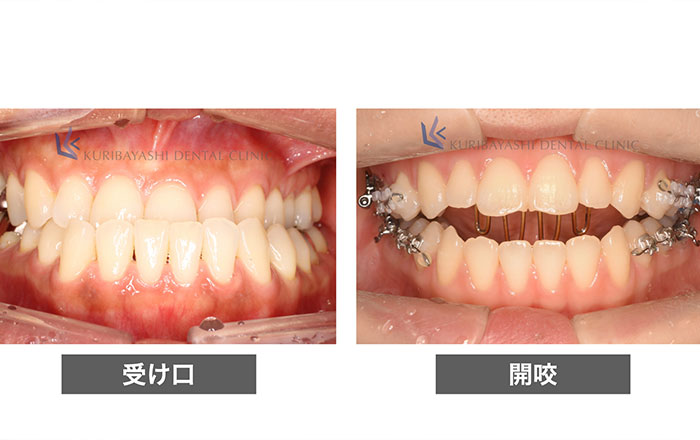 開咬の歯並びとは、上下の前歯に隙間が空いてしまって、前歯が噛み合っていない状態のことを言います。