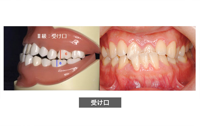 受け口の歯並びはしゃくれとも言われ、下顎が上顎よりも前に出てしまう状態で、顎の骨が反対になっています。