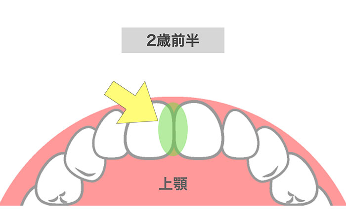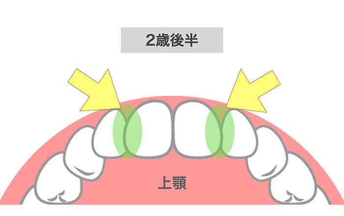 2歳前半のお子さまがむし歯になりやすい部分は、「上顎の唇側の前歯の間」がむし歯になりやすいです。