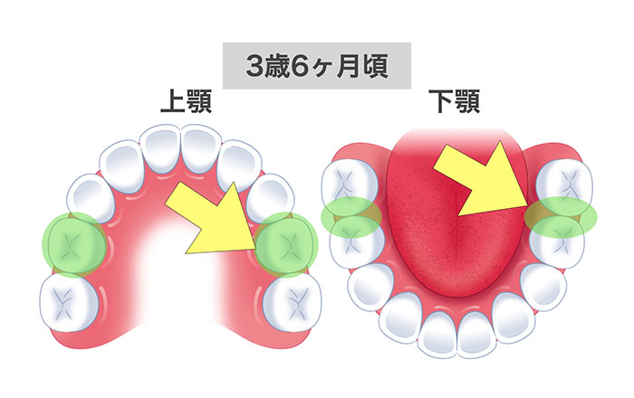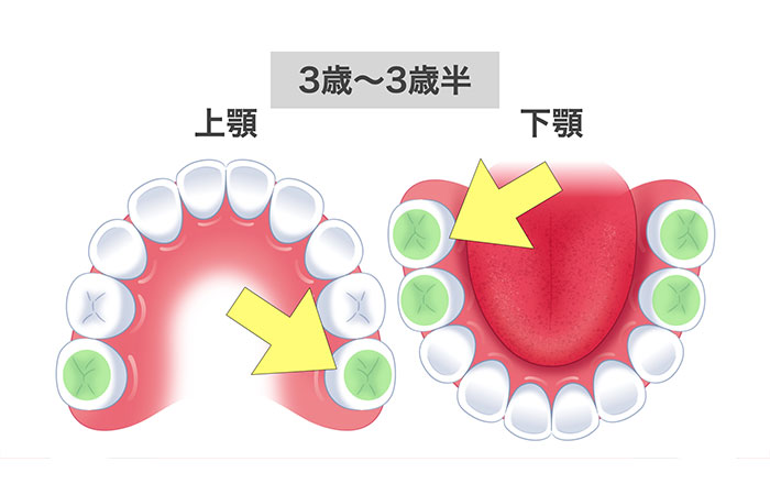 3歳半〜のお子さまがむし歯になりやすい部分は、「上顎は、奥歯から1本手前の歯、下顎は奥歯の間」がむし歯になりやすいです。