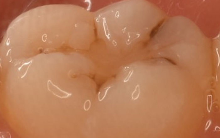 初期むし歯(CO)が進行して、歯の一番外側のエナメル質の表面に穴が空いています。この段階も、まだ痛みはありません。
