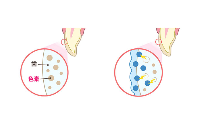 この時に発生した酸素が、歯の着色の原因の色素と結合すると無色になります。